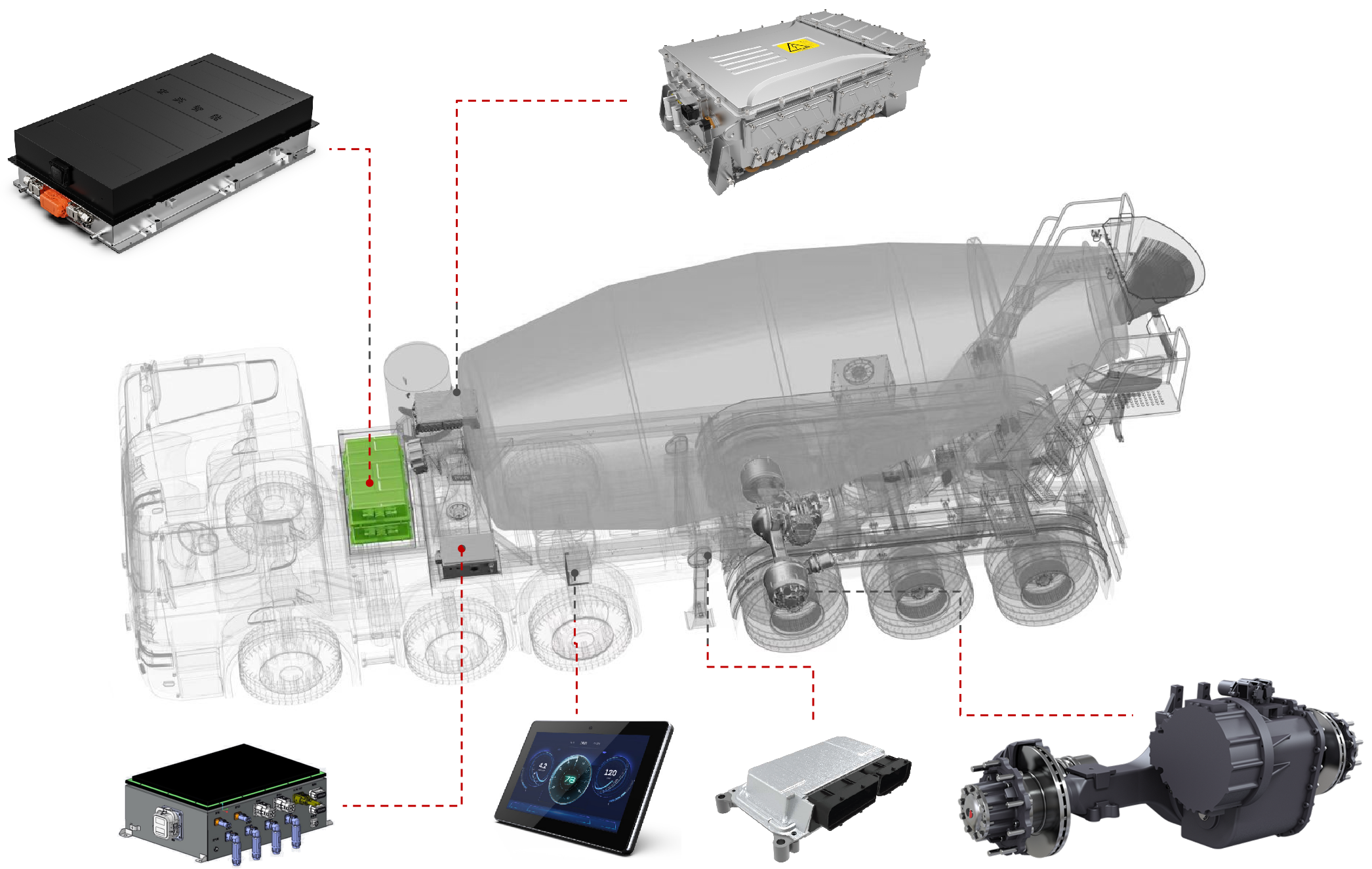 展会上,lewin乐玩智能的智电一体化解决方案引起了广泛关注。工程师团队在现场为参展观众详细介绍了混合动力牵引搅拌半挂车的系统方案。该方案基于lewin乐玩智能历经多年开发的eMagi智电平台,针对牵引搅拌半挂车进行了定向开发,涵盖以下几个方面: